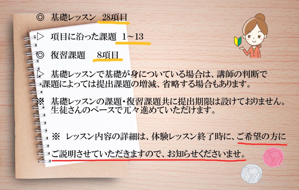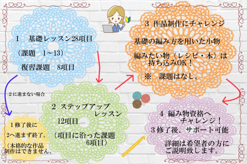 また、基礎レッスンを修了後、ステップアップレッスンに進まない選択もできます。ただし、その場合は本格的な作品制作にはチャレンジできません。編み方の種類や技法・作品、まだまだ無限にあるため、ステップアップを修了後も項目以外に沢山学べることがありますので、基礎レッスンのみで終了する場合はその先はサポートできませんのでご了承ください。