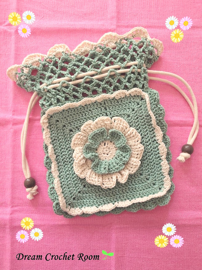 中心に花モチーフがある正方形モチーフを編み、引き抜き編みで閉じた後、上部のネット編み8段編んだ可愛い巾着ポーチです。開口部は約15cm、内布なし。ネット編みの隙間を利用してロープを通しています。コードを編んだり配色を変えたりしてもアレンジが楽しめる巾着です。とても上手に綺麗に編めました♬