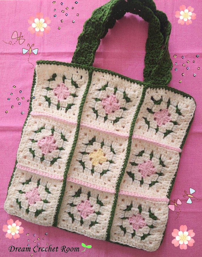 四角形モチーフを9枚つなげたものを2枚、外表にして更にとじ、模様編みの紐をつけたモチーフのバッグです。モチーフつなぎは緑とピンクの糸で色分けをして、可愛いポイントになっています。とても素敵に完成されました♬